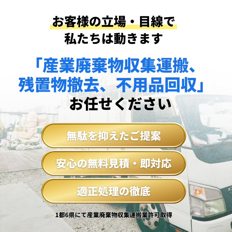 株式会社リアライズは、業務を行う埼玉県・東京都・千葉県・神奈川県・茨城県・群馬県・栃木県の1都6県にて産業廃棄物収集運搬業許可を取得している正規の業者ですので、各種廃棄物の収集や運搬も安心してお任せください。