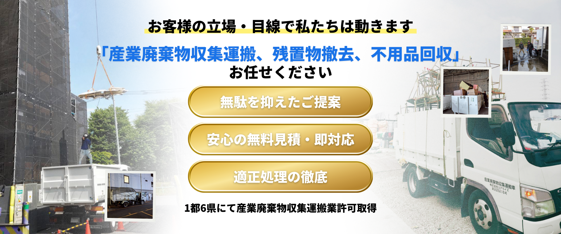 当方は埼玉県・東京都・千葉県・神奈川県・茨城県・栃木県・群馬県の1都6県にて、産業廃棄物収集運搬業者の許可を取得しており、解体工事やリフォーム工事で発生する廃棄物の収集運搬に対応しています。